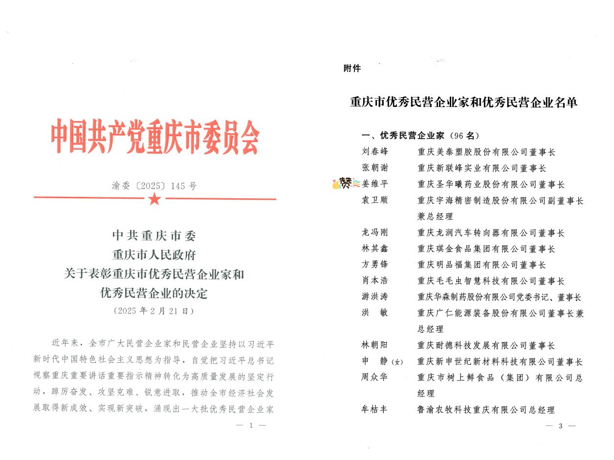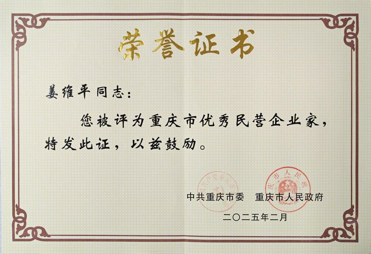 2025年2月21日下午,重庆市举行深入推动民营经济高质量发展大会。会议强调,深学细悟笃行习近平总书记在民营企业座谈会上的重要讲话精神和重要论述,做到“总书记有号令、党中央有部署、重庆有行动”。为推动全市经济社会发展取得新成效、实现新突破,充分发挥模范作用,引导和激励广大民营经济人士当先锋立新功,会上表彰了一大批优秀民营企业家和优秀民营企业。我司董事长姜维平先生凭借自身卓越的领导才干以及对市场的精准洞察力,在助推企业科技创新、创造就业岗位、切实履行社会责任等诸多方面表现极为突出,荣获“重庆市优秀民营企业家”这一殊荣。