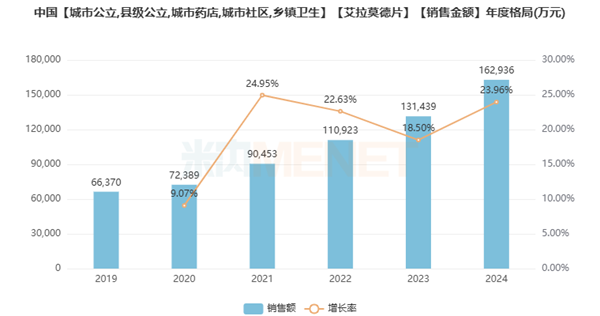 艾拉莫德片在中国抗炎和抗风湿药物市场中占据重要地位,近年来市场规模快速增长。据米内网数据显示,2024年其销售额已达约16.29亿元,同比增长约24%,位列同类产品前列,市场需求旺盛。