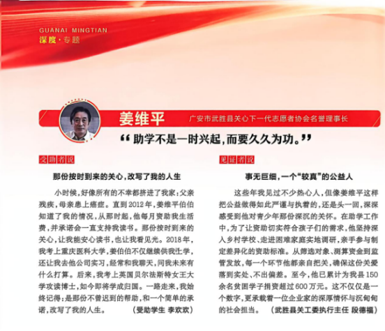 自2012年起,重庆圣华曦药业股份有限公司董事长姜维平先生始终关心支持广安市武胜县教育事业,坚持为困难学子提供助学金,多年来爱心惠及数百名寒门学子,累计捐赠超 600 万元。数十名学子在他的激励下顺利考入大学,走出大山。