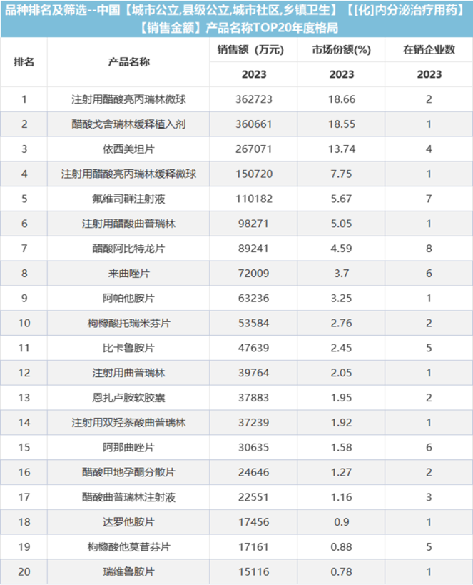 依西美坦片为国家医保乙类品种。在中国城市公立医院、县级公立医院、城市社区及乡镇卫生院终端,依西美坦片2023年销售额超过了26.7亿元,在内分泌治疗用药化学药中市场份额为13.74%,排名第三,市场前景广阔。