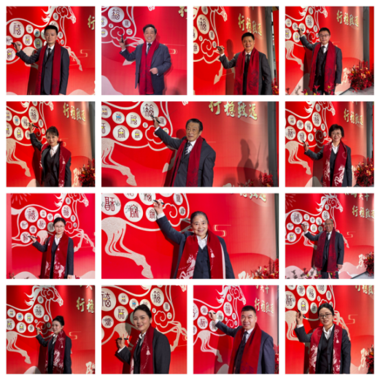 签到现场,圣华曦的家人们佩戴寓意龙马精神的红围巾纷纷在签到墙前打卡合影,记录这一欢乐时刻,共庆新春。